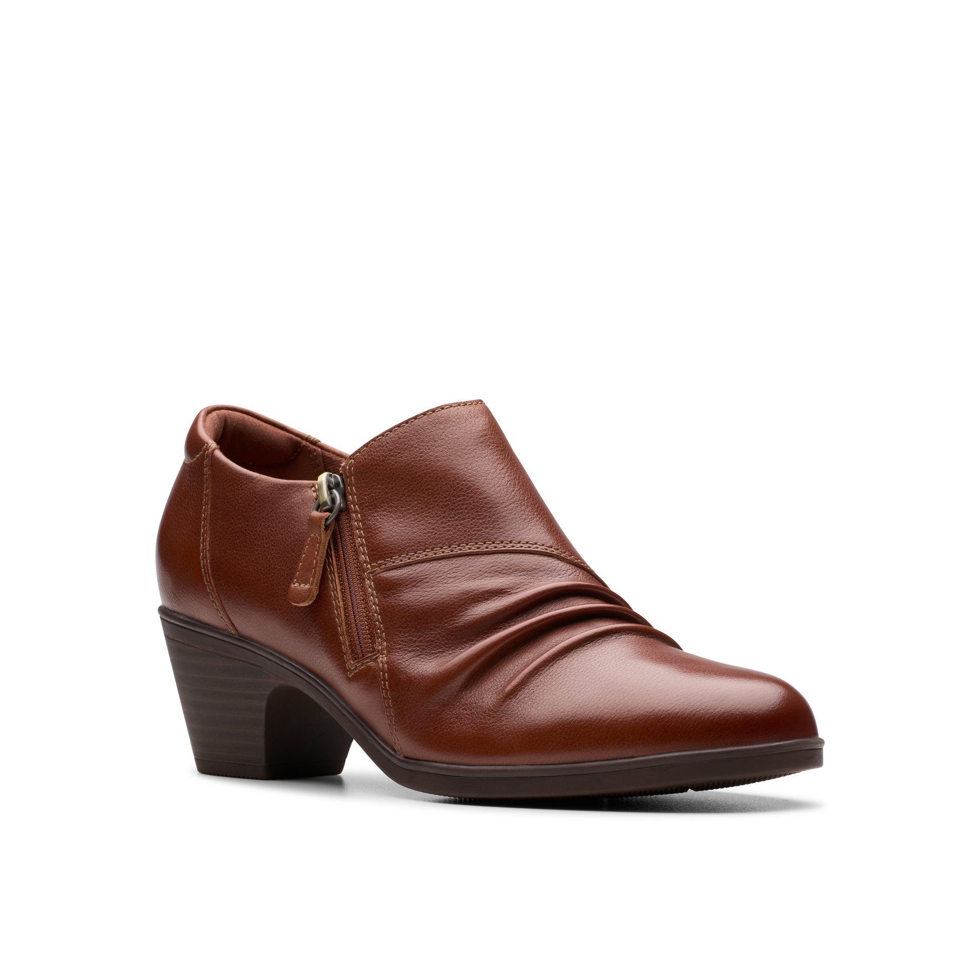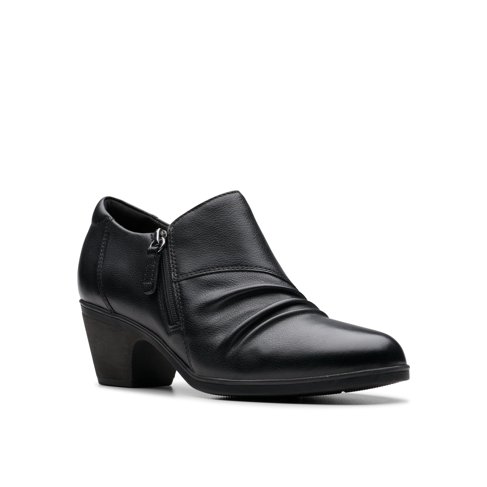 These shoes are a leather upper with rubber dress sole. The heel is about 1.5 inch. They have a side zip for entry and ultimate comfort insole.