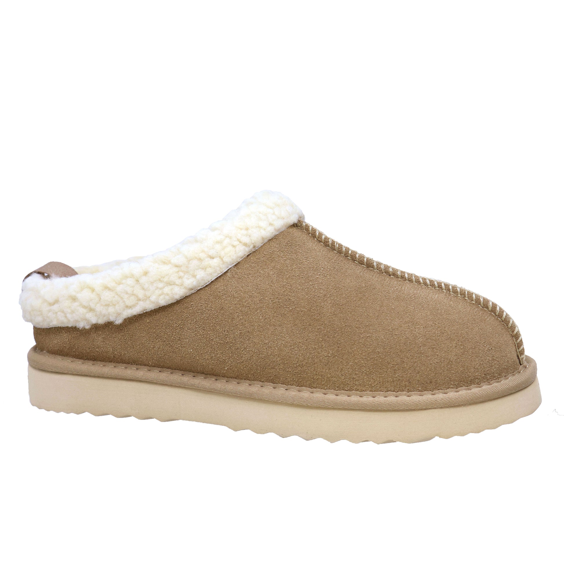 These slippers are a suede upper with warm faux fur lining. They are lightweight and have a rubber outsole.