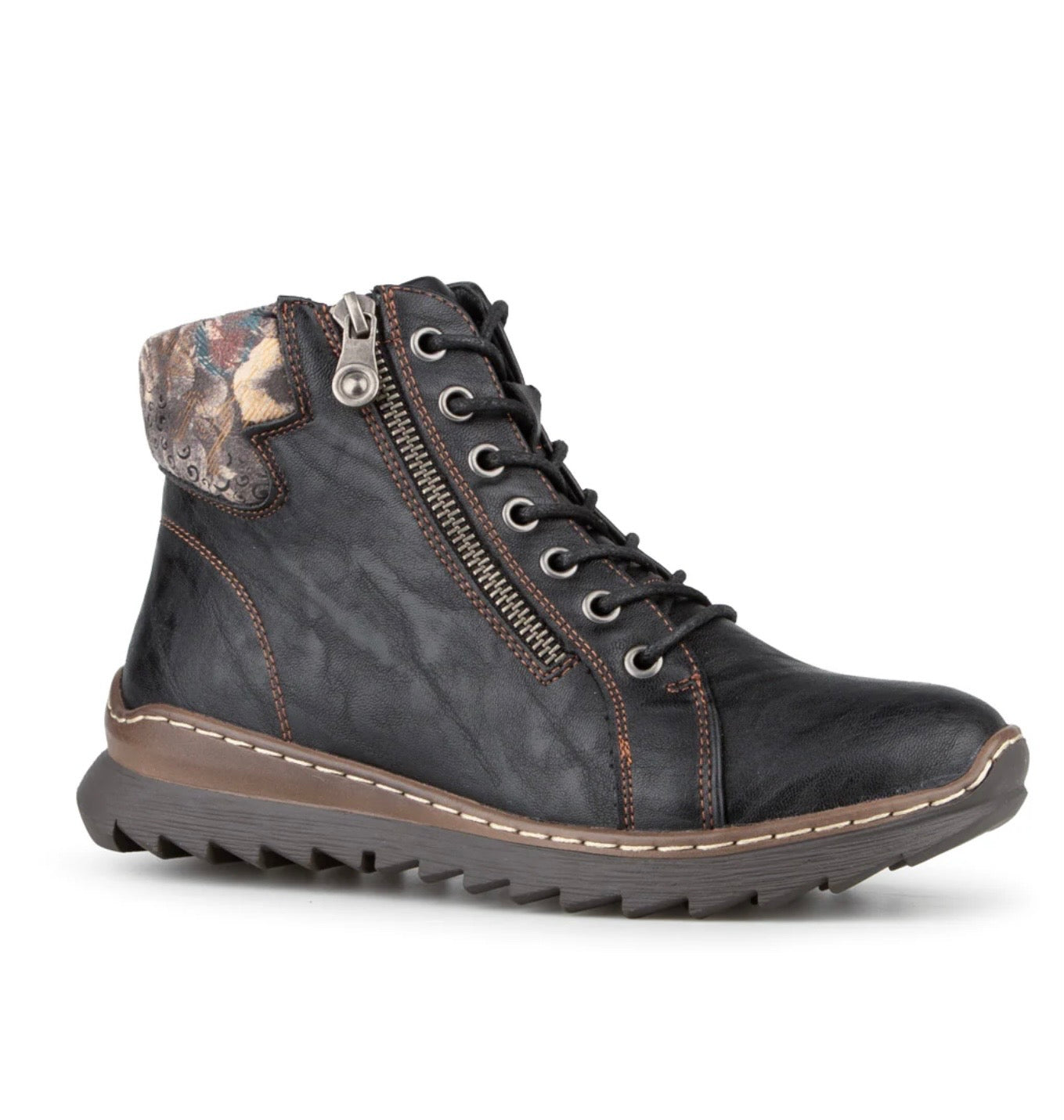 This boot is a synthetic upper with synthetic lining. It has a zipper and lace for easy access, the insole is removable to accommodate a custom orthotic and has a TPR outsole.