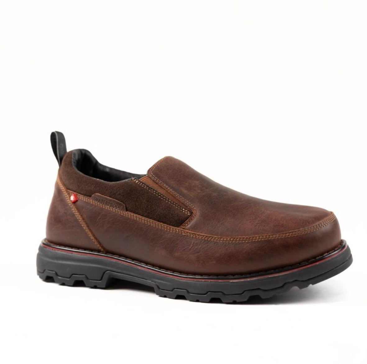 This shoe is insulated, temperature rated to-25C, leather waterproof upper, side zip, and a 50% merino wool lining. It has a rubber sole with ice grip and flip over cleat for protection on ice. It is available in a wide width.