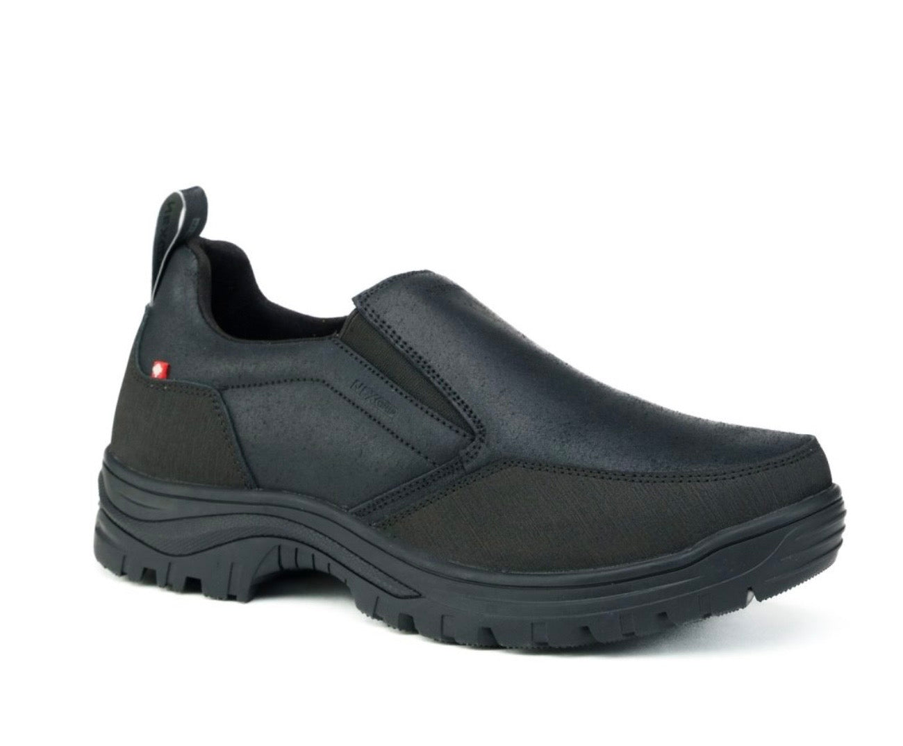 This shoe is insulated, temperature rated to-25C, leather waterproof upper and has a side zip. It has a rubber sole with ice grip and flip over cleat for protection on ice.