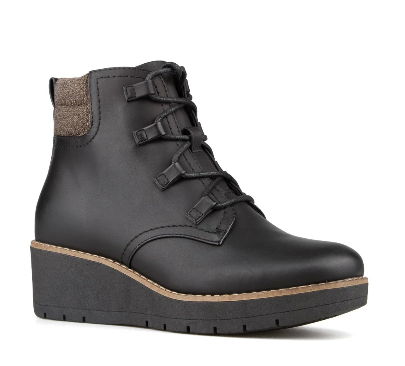 This boot is a synthetic upper with a 2” wedge heel. It has a light lining with removable felt insole, and a TPR outsole that reduces slipping. It has a lace and zipper for easy access.